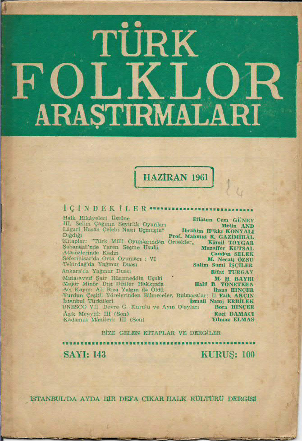 * Dergi Adı: Türk Folklor Araştırmaları Dergisi * Basım Tarihi: Haziran 1961 * Cilt: 6 * Yıl: 12 * Sayı: 143 * Arşivimizde Mevcut Mu? : Var |