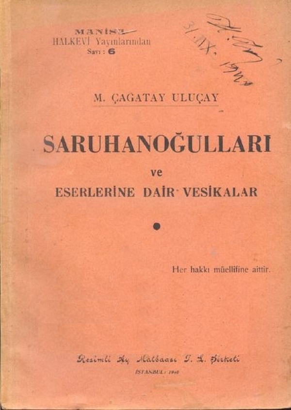* Kitap Adı : Saruhanoğulları ve Eserlerine Dair Vesikalar - 1 * Yan Başlık : (773 .H.- 1220 H.) * Yayınevi : Manisa Halkevi Yayınları * Yazar : Uluçay,Mustafa Çağatay * Basım Yılı : 1940 * Basım Yeri : İstanbul * Toplam Sayfa : 217 * Yayın No : 6 * Arşiv : Yok